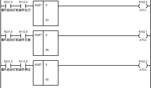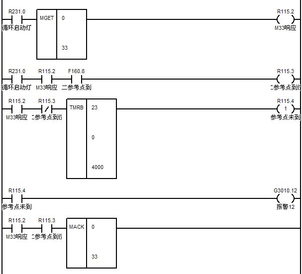 ????? M34的實(shí)現(xiàn)與M33類似,通過檢查F寄存器0組第8,9,10,11位可以檢查預(yù)設(shè)定的機(jī)床第二,三,四,五參考點(diǎn)。另外也可以根據(jù)需要寫出相似的代碼用來檢查每個(gè)運(yùn)動軸的參考點(diǎn)。